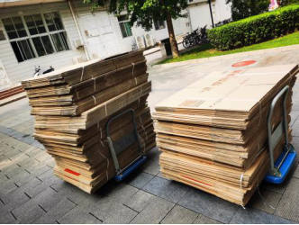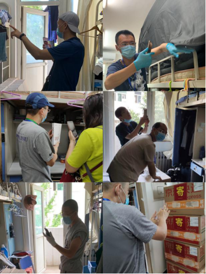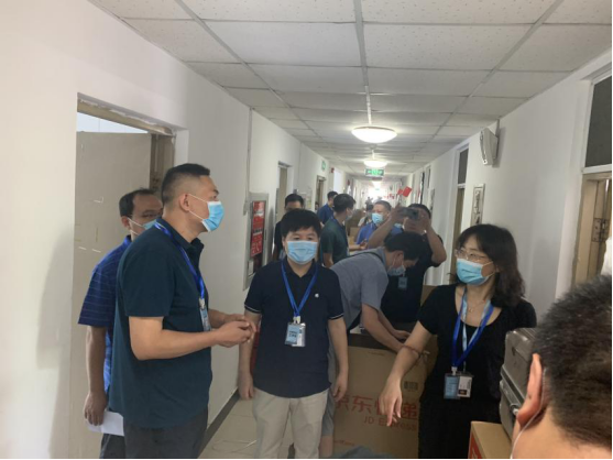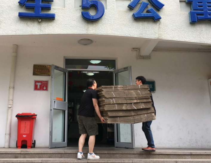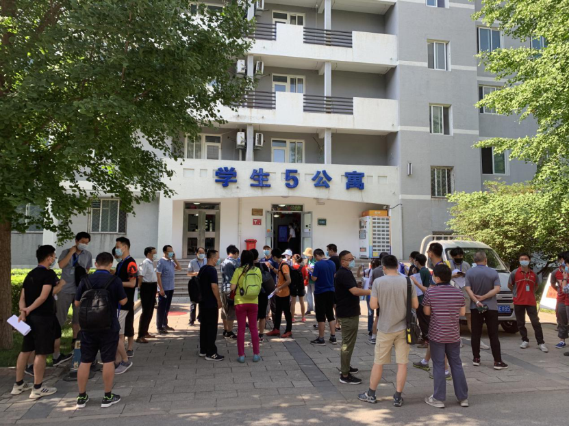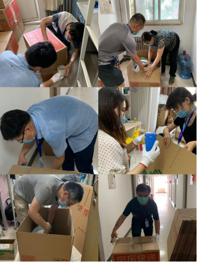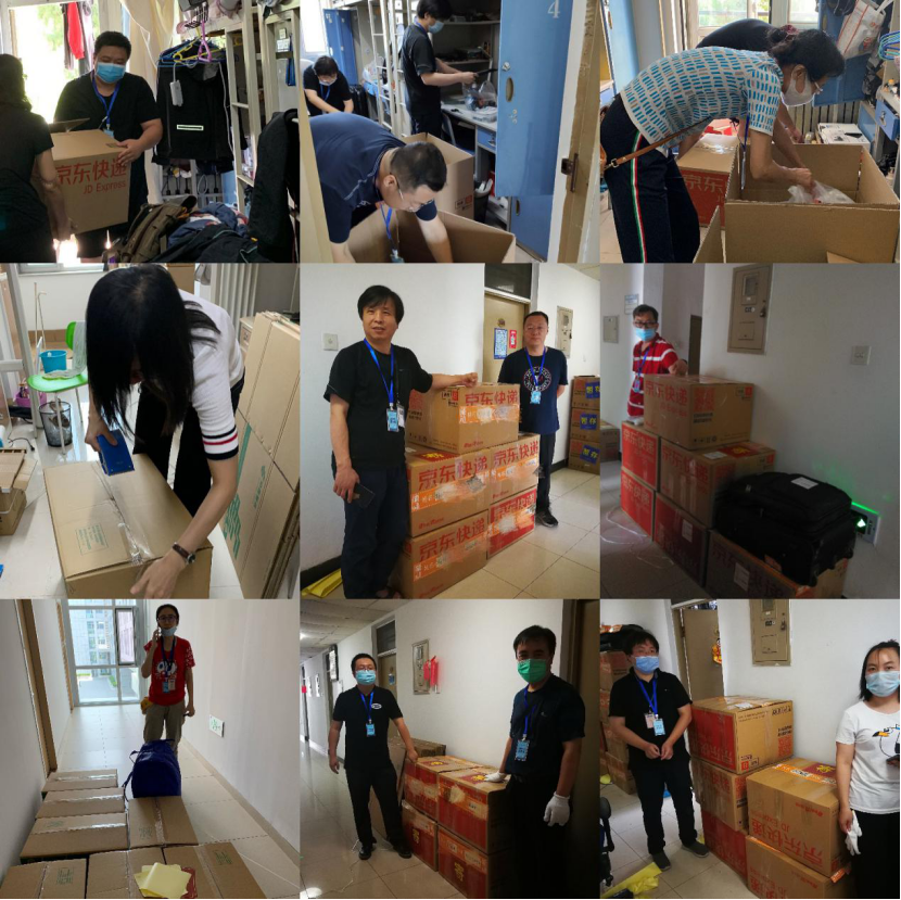 7月5日9时,71名教师和辅导员在校内5号楼前集合,领取打包物资袋,并进入宿舍开始一天的打包工作。
