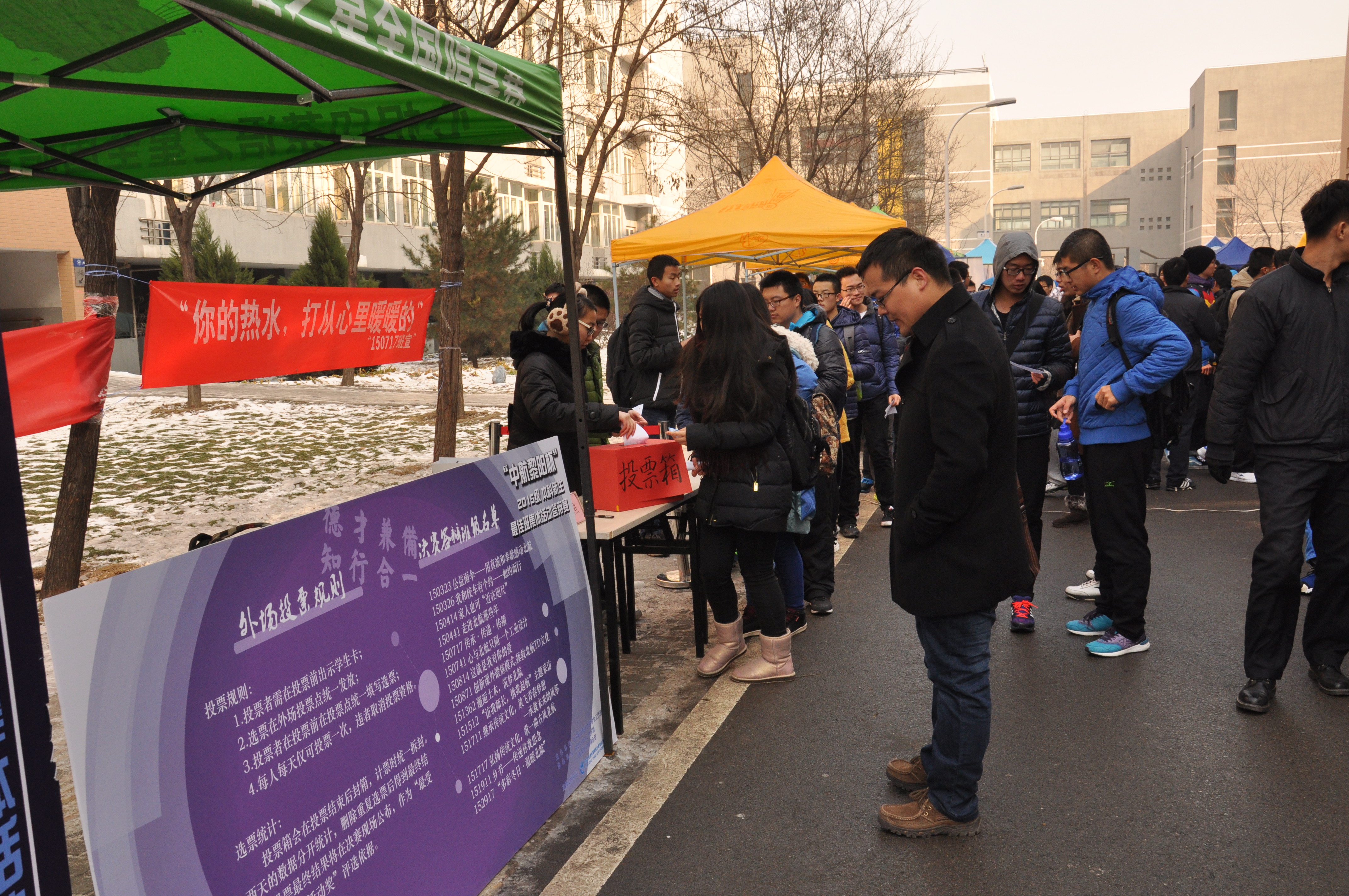 在本次比赛外场宣传活动中,每个班级都以蓬勃朝气彰显青春活力,用满腔热血弘扬“北航四爱”。在1、4号员工公寓之间的马路上,激情澎湃的口号声使得现场气氛热烈非凡。横幅与海报诉说着班级活动的点点滴滴,使同学们体会到了班集体活动的魅力。同学们纷纷驻足观看,置身于青春与激情的海洋。在外场展示中,参赛班级选取了丰富多彩的形式,向同学们介绍本班活动主题及内容,邀请同学们参与小游戏并赠送纪念品,部分班级还贴心地为同学们提供热饮。同学们根据展示内容进行投票,外场投票结果将与线上投票结果结合,产生本届最受欢迎班集体活动奖。