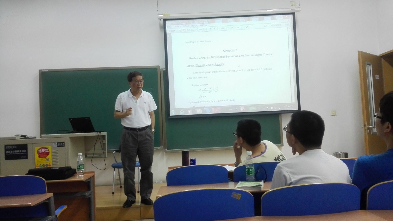 陆鹏举教授开授的“流体力学特论”引智课程,面向有一定流体力学基础知识的高年级本科生与低年级硕士生。陆教授采用了在普林斯顿、成功大学使用的英文教材、教学理念以及上课方式。从流体力学最基础的基本方程推导开始逐步引导员工进入一个全新的学术领域。课堂上,陆老师对课程内容把关十分严格和细致,从偏微分方程求解与特征线理论,到无粘流动理论与激波的基本关系式方程、方程的守恒形式等等要素全都逐一向同学们详细讲解。在课堂上,陆教授会随着课程的进行穿插许多在目前工程实际中已经得到成熟运用的计算流体力学实例来激发同学们对于学科的兴趣,并随机挑选一些经典的流体力学问题在课堂上与同学们共同讨论并寻求解决方案;而在每天的课程结束之前,陆教授又会带领大家回顾一天所学到的知识,做到温故而知新。