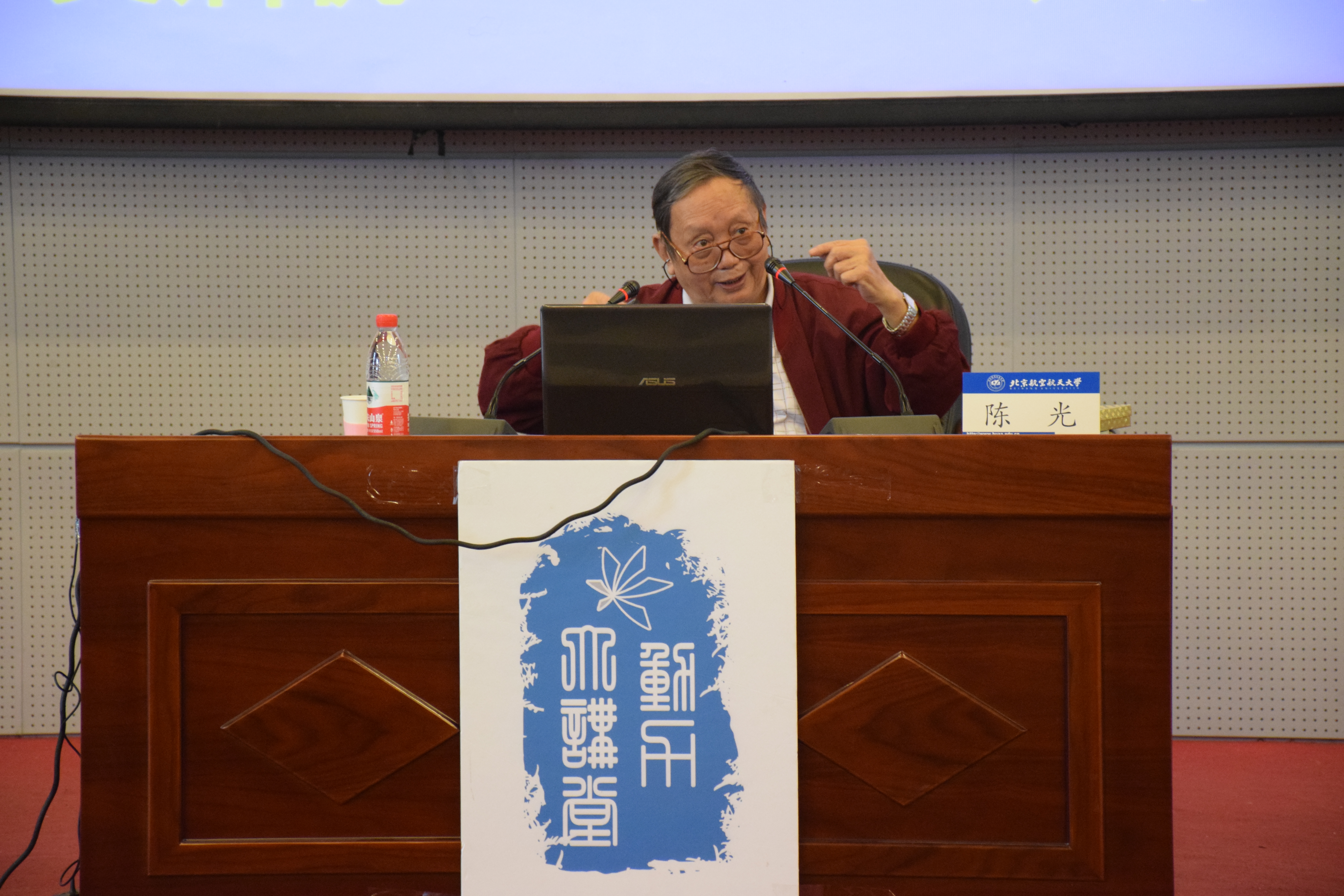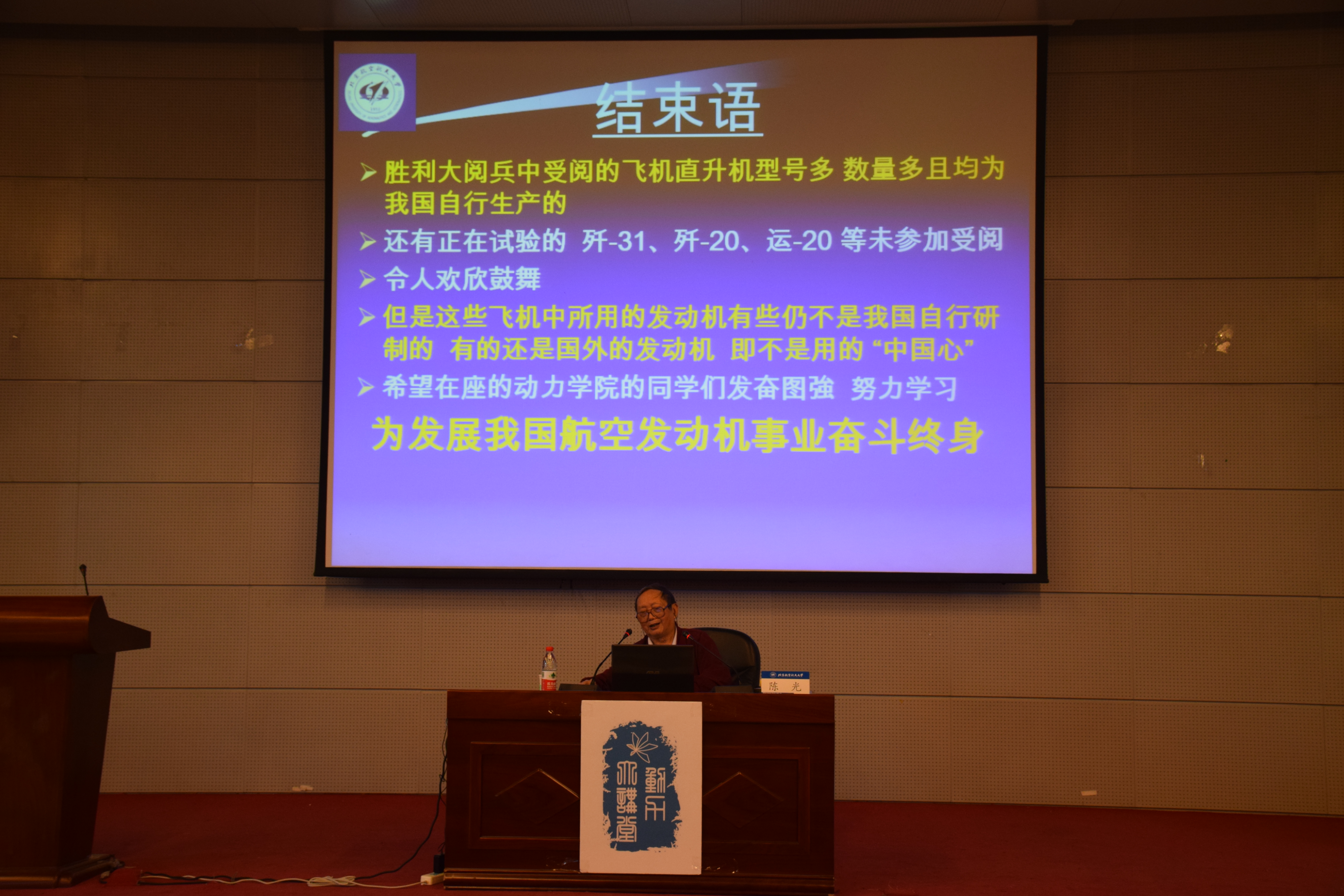 2015年10月17日下午,北航365best体育官网登录老教授陈光先生来到沙河校区,为同学们带来了题为“巨龙亮剑”——大阅兵中的几型飞机的讲座。讲座开始之前,老教授为同学们讲述了在国家刚刚解放时,前辈们学习生活条件的艰苦,勉励同学们在这生活条件优越的年代要更加努力的学习,对得起老一辈为我们做出的贡献。