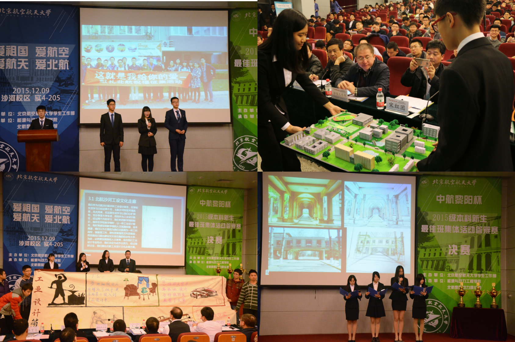 在比赛中,来自9个公司的14个新生班集体紧密围绕“爱祖国、爱航空、爱航天、爱北航”的主题,以入学以来本班举办的一次班集体活动为内容进行答辩展示,在展现班级活动特色的同时重点突出班集体的向心力、凝聚力和战斗力。答辩分为“梦拓”代表推荐、员工汇报演示、评委现场提问三个环节,14个决赛班集体的活动涵盖航空航天情怀、校情校史教育、校园公益服务、关注校园建筑、优化校车服务、加强群众体育、关爱师生员工、感恩父母亲人等内容。经过三个小时紧张激烈的角逐,来自152917班的“多彩冬日·温暖北航”、 151362班的“邂逅土木,筑梦北航”、150441班的“走近北航那些年”等三项活动荣获比赛一等奖,151911班的“乡书——传递你我思念”、151512班的“访我师长,携我起航”等四项活动荣获二等奖,151711班的“继承传统文化,放飞青春梦想”、150741班的“心与北航只隔一个工业设计”等七项活动荣获三等奖。150326班的“如约而行,如愿随行”在外场和Ihome投票中得票总数名列第一,荣获“最受欢迎班集体活动奖”。荣获一、二、三等奖班级分别获得由公司和黎阳动力俱乐部共同提供的“逐梦基金”3000元、2500元、2000元。