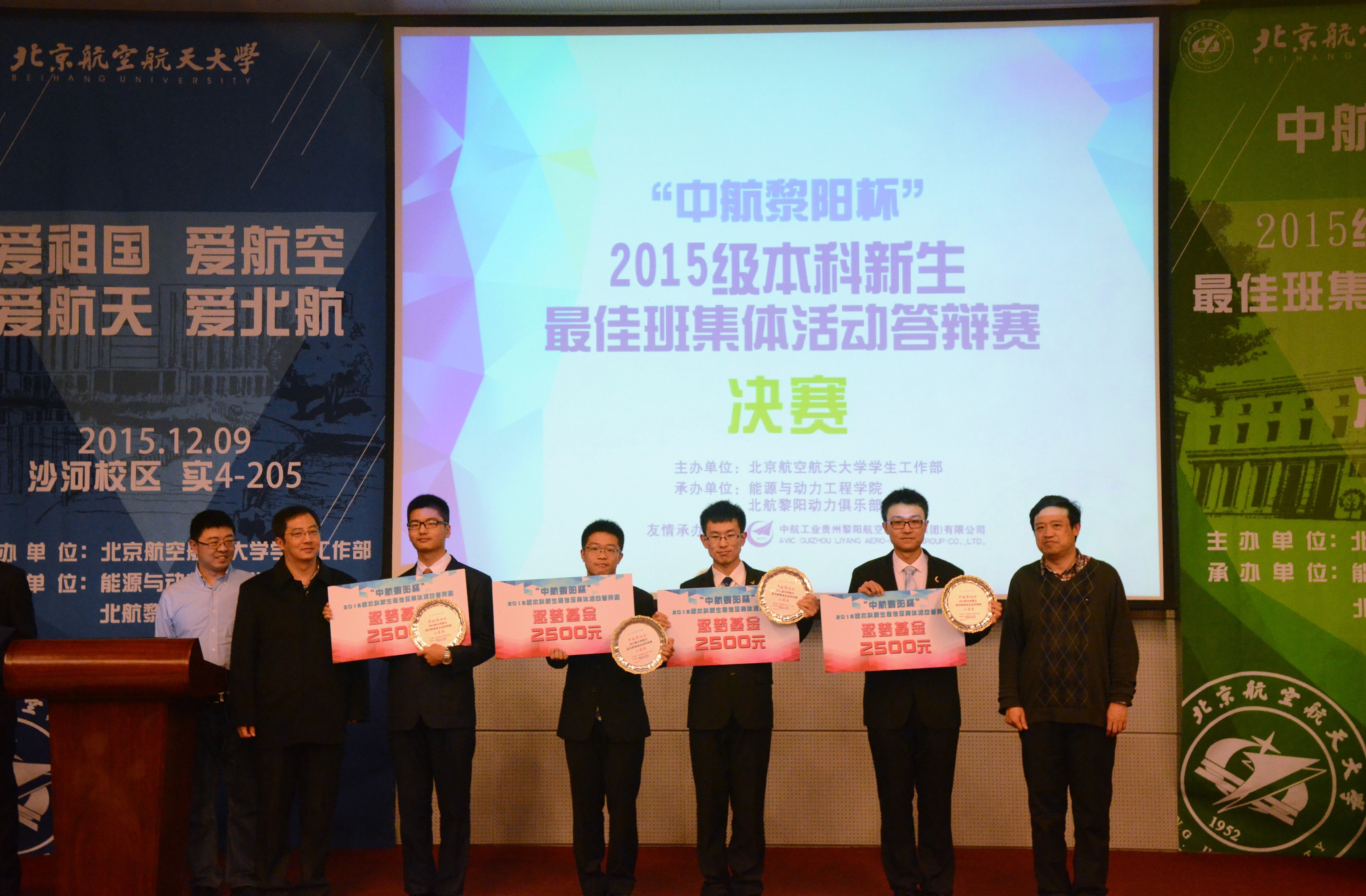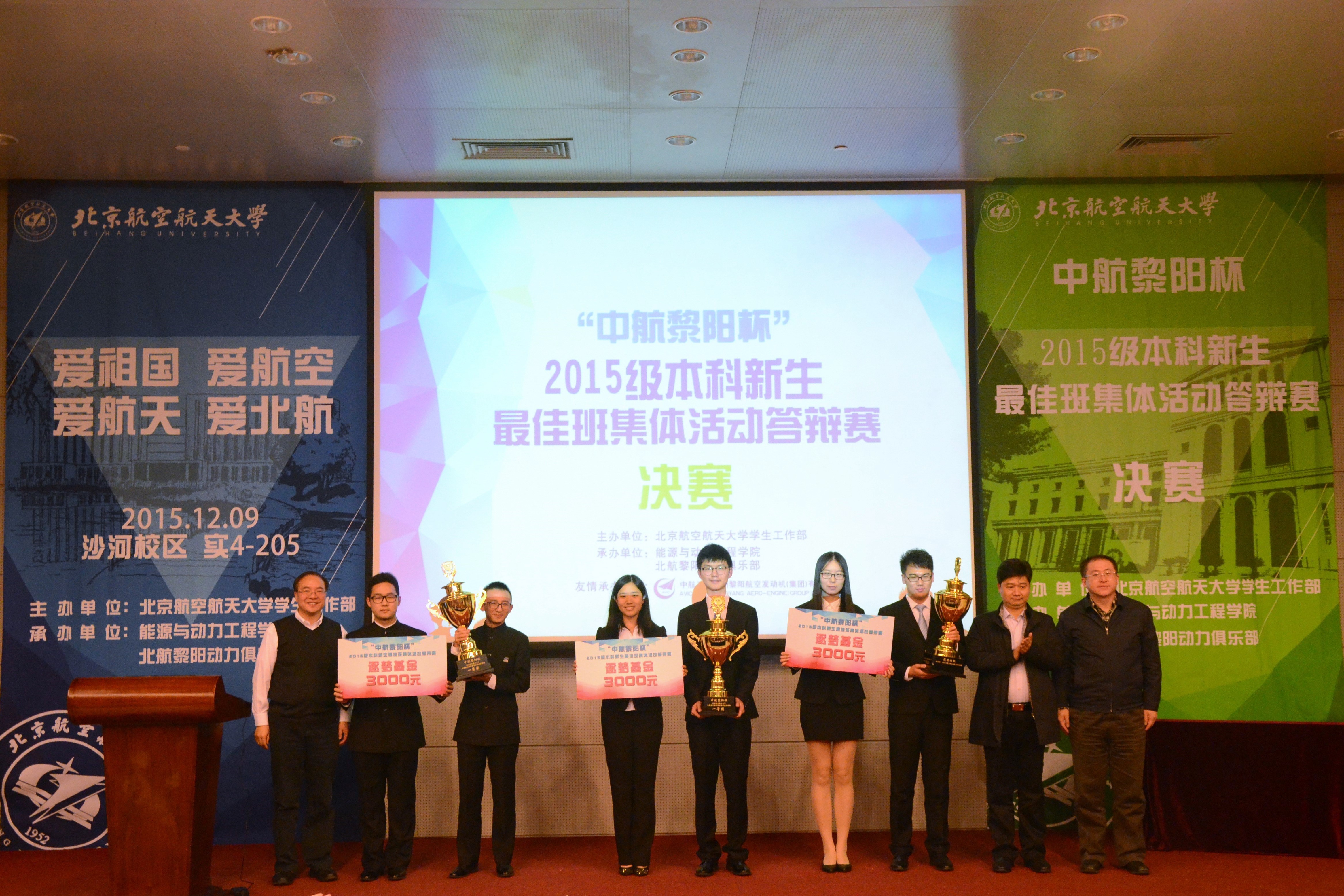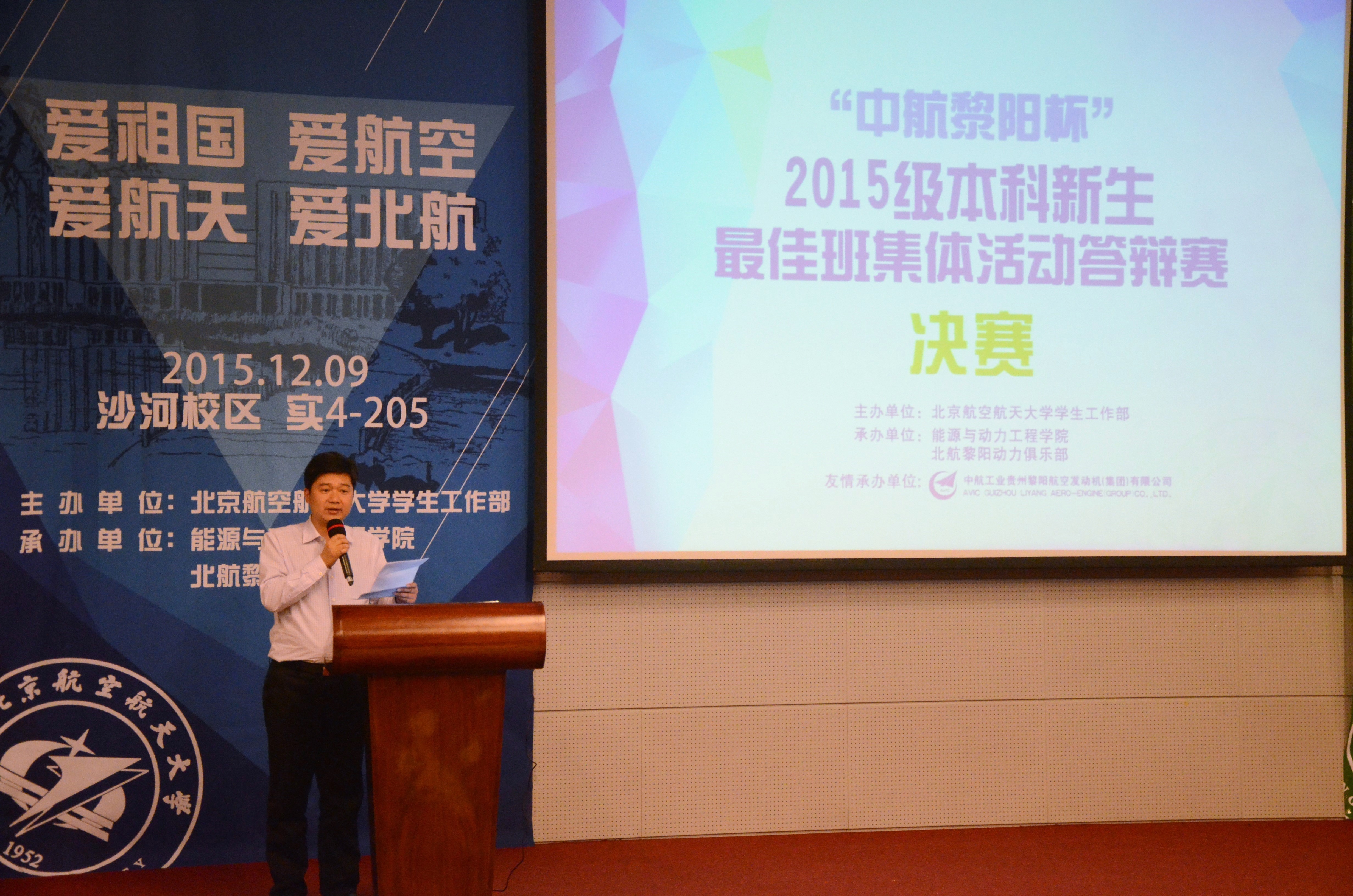 12月9日晚,由365亚洲体育网入口员工工作部主办,365best体育官网登录、北航黎阳动力俱乐部共同承办的“中航黎阳杯”365亚洲体育网入口2015级本科新生最佳班集体活动答辩赛决赛在沙河校区实验四号楼205报告厅圆满落幕。中航工业贵州黎阳航空发动机(集团)有限公司副总经理宋红团、人力资源部部长姜庆、团委书记李业龙作为嘉宾评委出席决赛,校沙河校区管委会、员工工作部、宣传部、人才招聘处、教务处、保卫处、团委、后勤集团、体育部及思政公司领导老师,及各公司员工工作干部30余人出席并担任评委。沙河校区管委会主任姚仰平老师对比赛进行了点评。