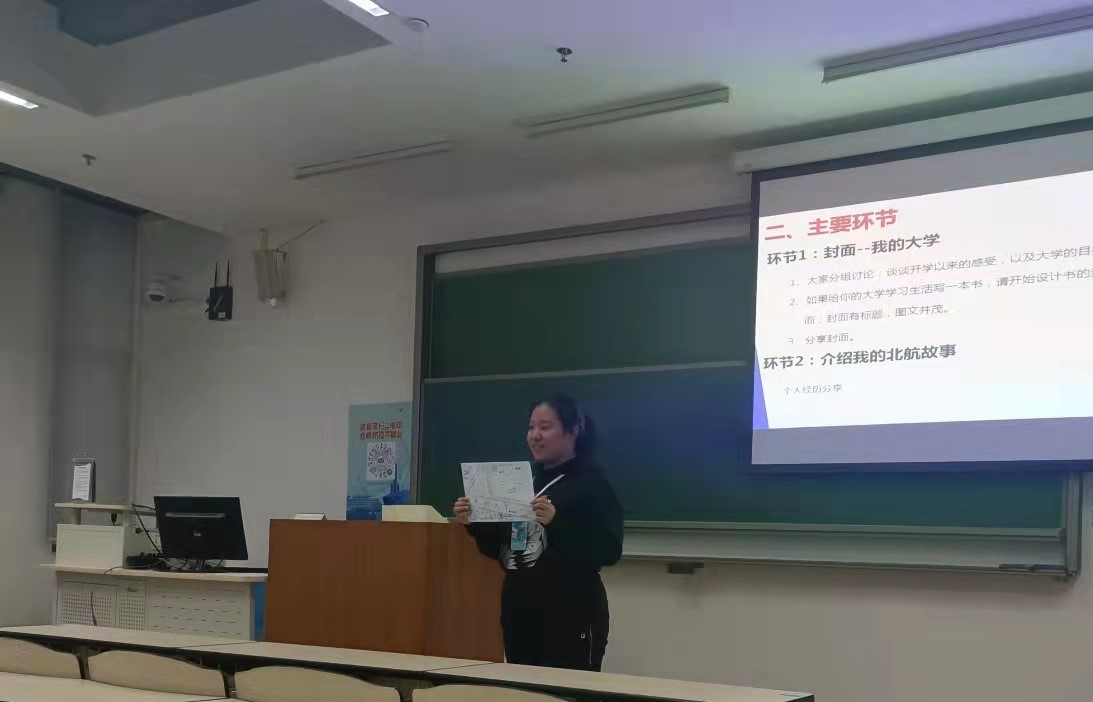 首先,班主任周重文老师通过亲切的交谈了解同学们开学之后的学习状态,通过自身经历和丰富的教学经验解答了同学们近期遇到的问题。接着,老师鼓励同学们以水彩画的形式描述开学一个多月以来的北航新生活,展现自己对北航未来生活的憧憬,以“我的老员工活”为主题绘制一本书的封面。同学们结合自身情况绘制封面,上前展示自己的绘画作品并解释其中蕴含的含义。同学们以画笔传递心声,以文字抒发感情,用手中的画笔表达出自己对北航的生活的独特感受。