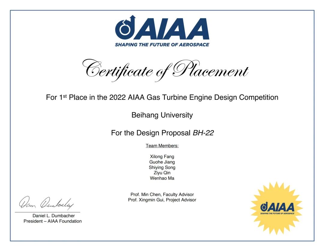 2022年10月17日,北航2018级本科生方玺龙、姜国河、宋世英、覃子宇、马文豪在指导教师陈敏教授、桂幸民教授的精心指导下,经过6个月的辛苦准备,在美国航空航天学会American Institute of Aeronautics and Astronautics(AIAA)国际本科生航空发动机设计大赛中获得冠军,这是自2017年以来,北航学子在此项赛事中第三次闯入决赛,第二次获得冠军。