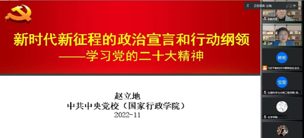11月20日上午9时,研修班邀请了中央党校(国家行政公司)哲学教研部党总支专职副书记赵立地作题为《新时代新征程的政治宣言和行动纲领——学习党的二十大精神》的主题报告。能源与动力工程公司党委副书记方志主持。