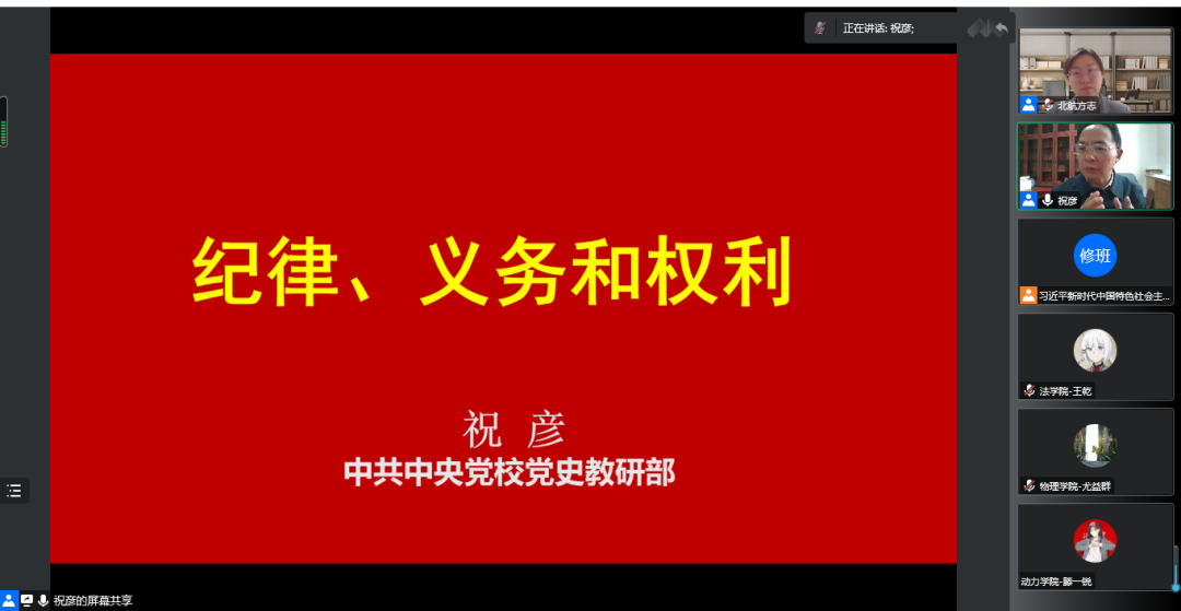 为深入学习宣传贯彻党的二十大精神,引导员工党员做习近平新时代中国特色社会主义思想的坚定信仰者和忠实践行者,北航举办第三期习近平新时代中国特色社会主义思想员工党员研修班。全校34个公司600余名新发展员工党员参与学习。11月27日上午9时,研修班邀请了中共中央党公司党史教研部祝彦教授作题为《纪律、义务和权利》的主题讲座,本次报告为研修班的第二次理论学习报告。由能源与动力工程公司党委副书记方志主持。