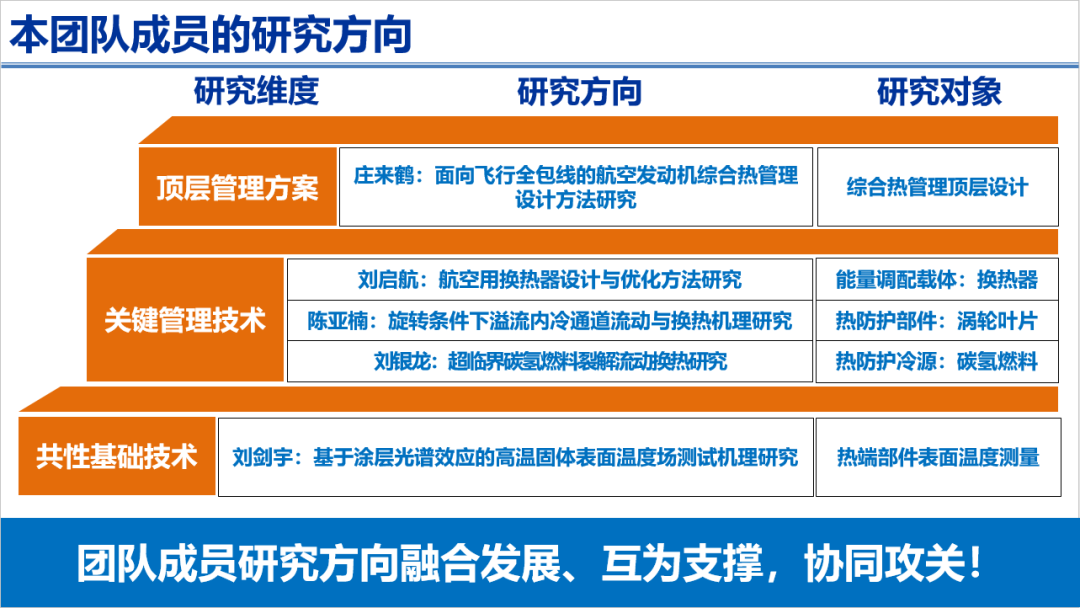 航空发动机综合热管理创新团队由徐国强老师的5位博士研究生组成,他们是:庄来鹤、刘启航、刘银龙、陈亚楠、刘剑宇。团队利用分布式能源与热管理团队平台资源,从顶层管理方案-关键管理技术-共性基础三个维度,开展热管理顶层方案、高效紧凑能量调配核心部件、热管理先进热防护机理和共性测量技术研究,在团队成员协同攻关的基础上,攻克了复杂能流网络多级耦合仿真技术、高效紧凑换热器工程样机设计及加工技术、非接触式高精度磷光测温等多项关键技术,攻克了系统和部件级热管理设计难题,解决了多项科学问题。