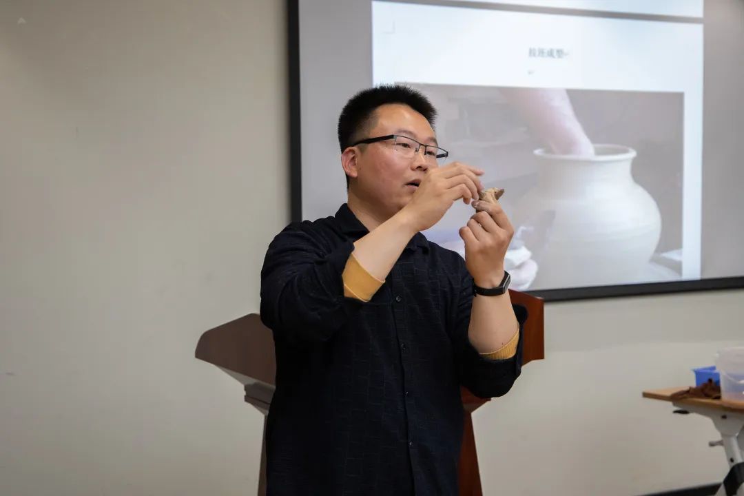 张老师首先为同学们讲解了陶瓷作品的原料——高岭土,以及陶和瓷原料选取上的区别。同样是黏土,陶泥因为铁含量高,烧制之后颜色会更深;而瓷泥铝含量更高,烧制之后呈现的颜色也就更白。此外,张老师还为同学们介绍了我国历史上陶瓷艺术最发达的宋代名窑,以及各个名窑出品的陶瓷艺术品的特点所在。