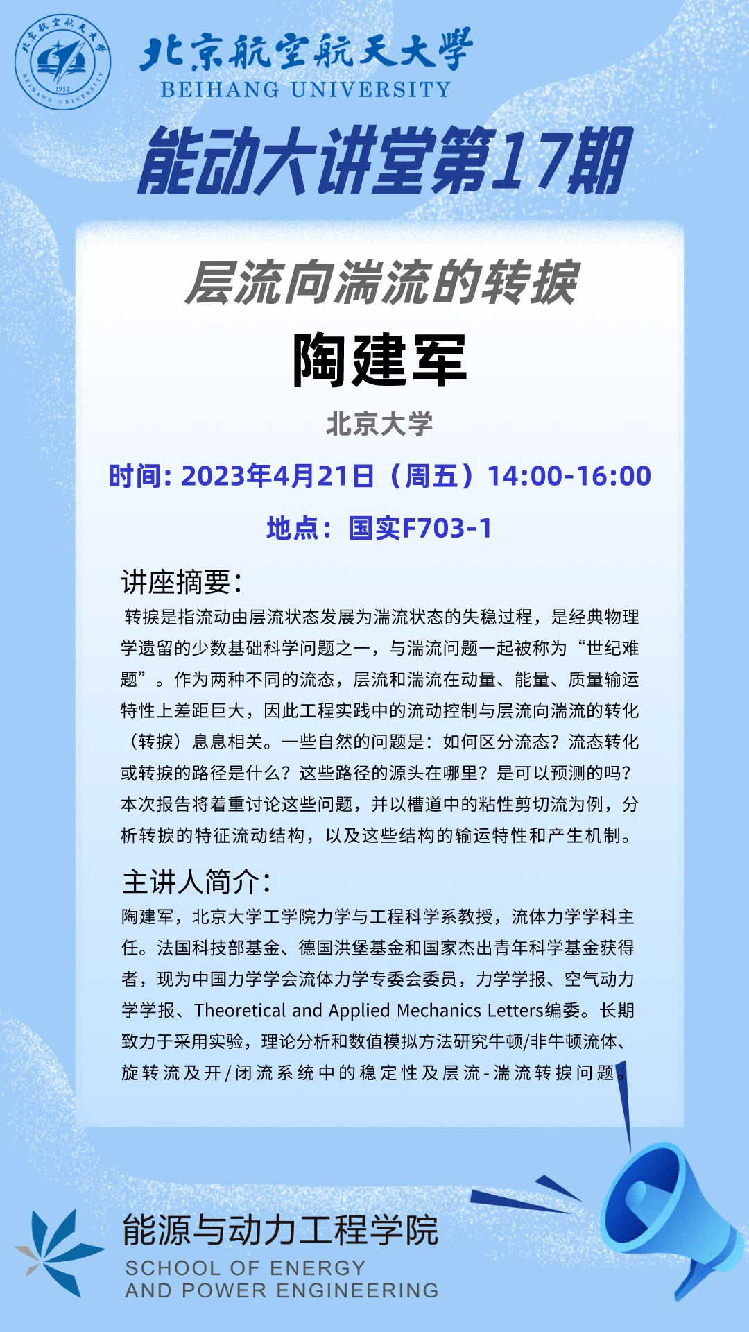 为了帮助同学们拓宽学术视野、了解学术前沿,365best体育官网登录特别举办高端学术论坛,邀请北京大学陶建军教授开展以“层流向湍流的转捩”为主题的学术讲座,与同学们共同探讨转捩难题。