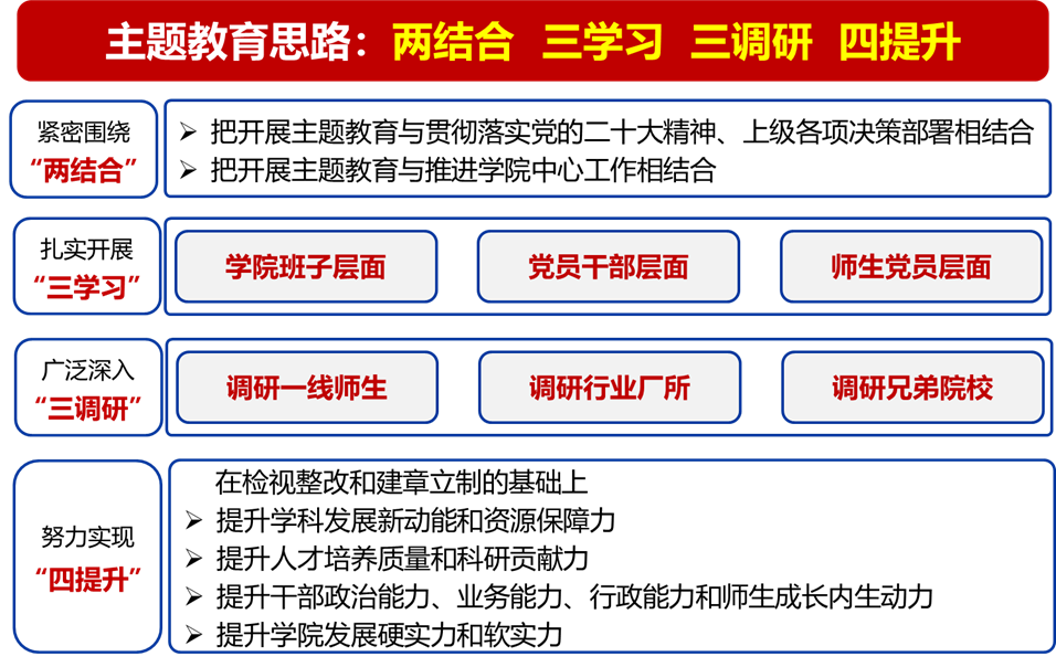 会议最后,董卓宁作总结发言。他强调,全院师生要坚持学思用贯通、知信行统一的根本任务,以创新理论统一思想、统一意志、统一行动,坚定拥护“两个确立”,坚决做到“两个维护”,依托学习日、“三会一课”等,做到边学习、边对照、边检视、边整改。紧紧围绕“两结合”,扎实开展“三学习”,广泛深入“三调研”,努力实现“四提升”,以推动各项事业高质量发展、提高师生归属感获得感认同感的新成效检验主题教育成果。