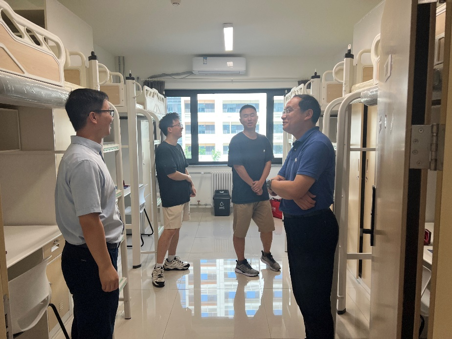 公司党委书记董卓宁与副书记谷萌来到研究生宿舍,与前来报到的新生亲切交流,询问大家的入学感受,了解大家的学习生活需求。