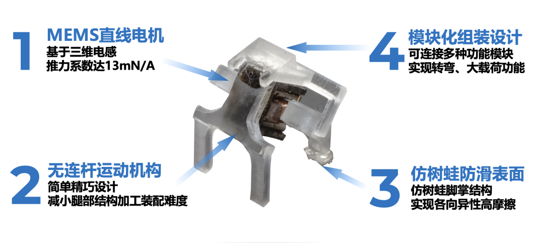 项目简介:本项目提出了一种MEMS技术加工制作的超微型高机动机器人平台:其动力系统是团队首创的MEMS三维电感为核心的超微型直线电机;将树蛙脚掌结构用于足部,大幅提升运动能力;运动系统具有多模态与模块化组合的优点,易实现未来不同需求。机器人体积小于5mm*5mm*5mm,速度接近48倍体长每秒、4倍自重负载、20°爬坡、40%体高越障、260°/s转向角速度,各项性能达国际领先水平,在精密仪器检测等领域应用前景广阔,已获得国防院所应用前景认证,与三家龙头企业达成初步合作意向,并获得中央广播电视总台、北京电视台等主流媒体的宣传报道。本科生科研团队以员工一作授权专利一项、受理两项、并以一作发表EI期刊一篇。中央广播电视总台采访报道,朝闻天下、央视新闻新媒体端播出。