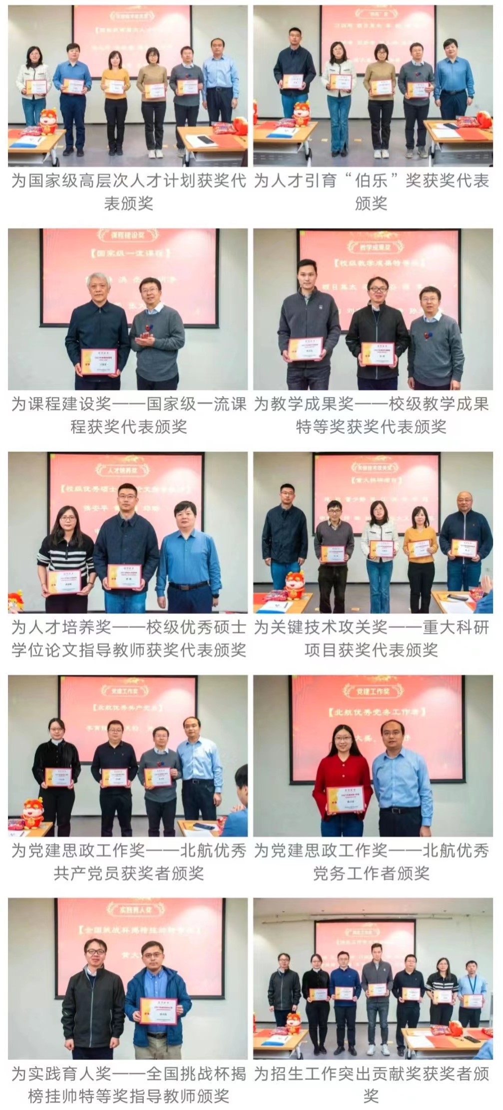 董卓宁宣读了公司2023年各项工作做出突出贡献的教职工名单。公司领导分别为获得高层次人才奖、人才引育“伯乐”奖、课程建设奖、教学成果奖、教学比赛奖、人才培养奖、关键技术攻关奖、党建思政工作奖、实践育人奖、招生工作奖等获奖教职工颁奖。
