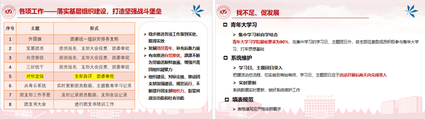 随后,各团支部书记依次进行述职,从班子建设、团员管理、组织落实、作用发挥等方面汇报年度工作情况,展现支部风采。在此基础上,团支部书记对工作中的不足进行了深刻反思,并提出了一系列改进措施。