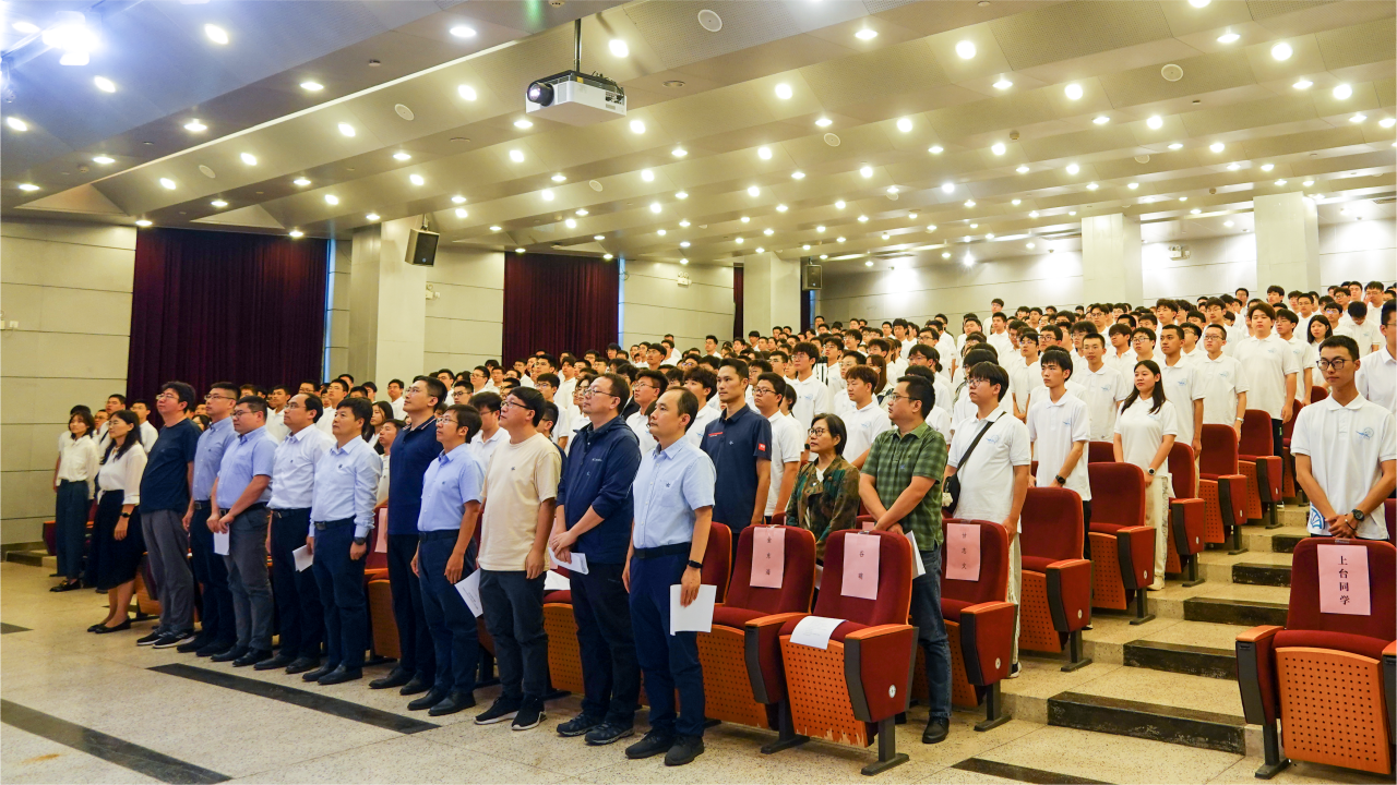 在庄严的国歌声中,开学典礼拉开帷幕,全体师生齐唱国歌,激昂着空天报国之志。