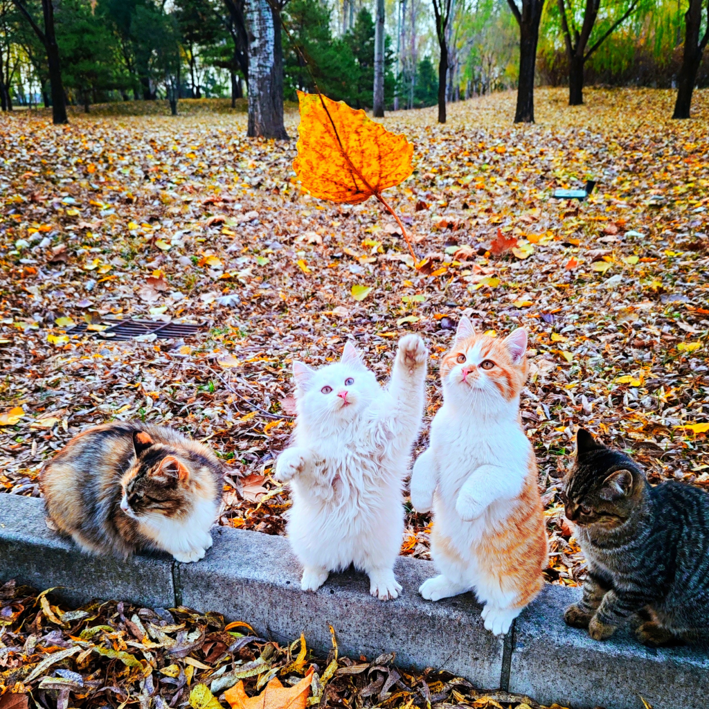 群猫不解秋风意,共嬉林间捕叶忙。作品《一起喵喵喵喵喵》捕捉到了生活的瞬间与美好,两只小猫站立起来拨弄空中飘落的树叶,似两个戏耍的孩童,神情专注、模样可爱。忙碌中也要适当放慢脚步,寻找和感受无处不在的美好。