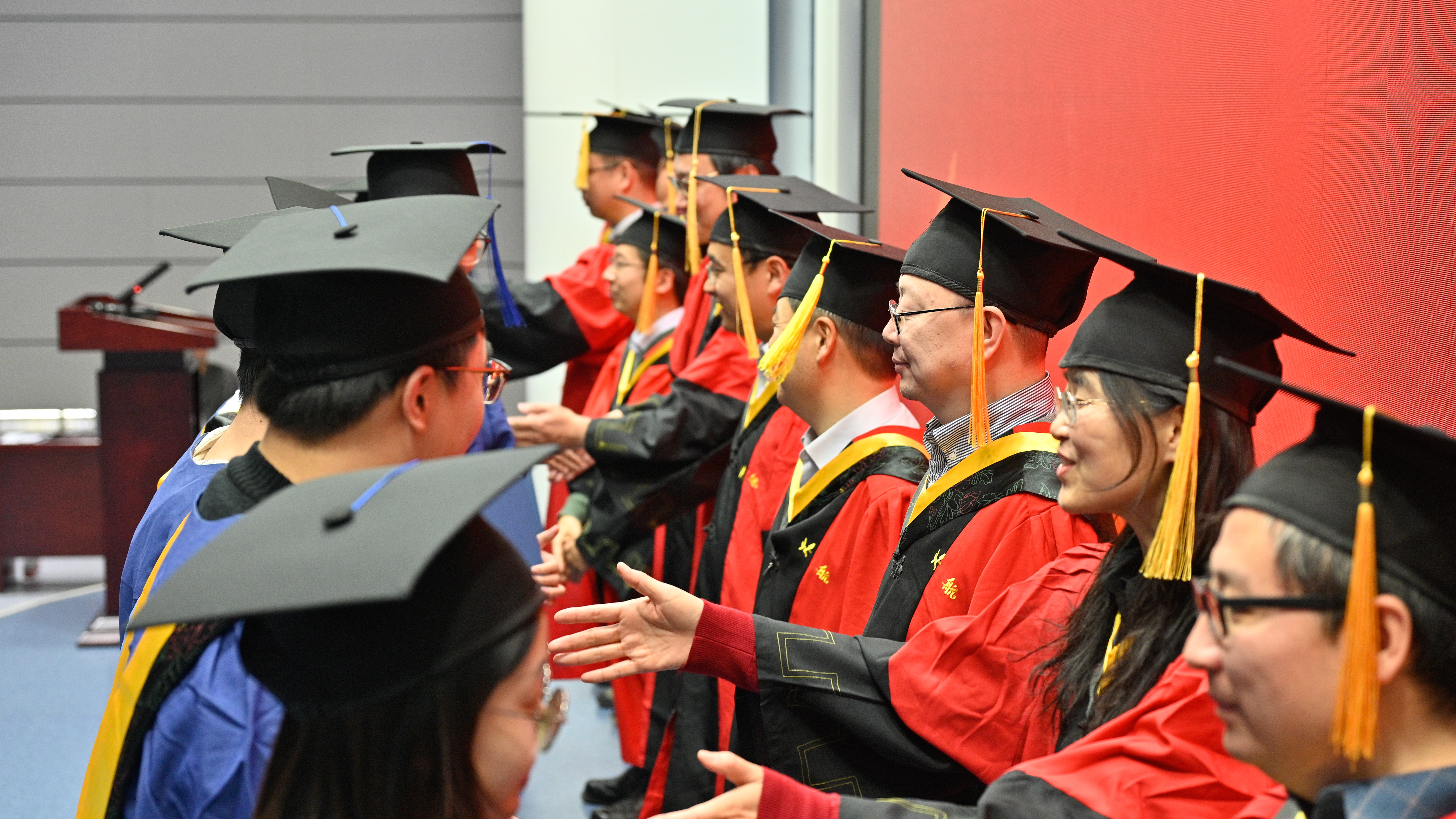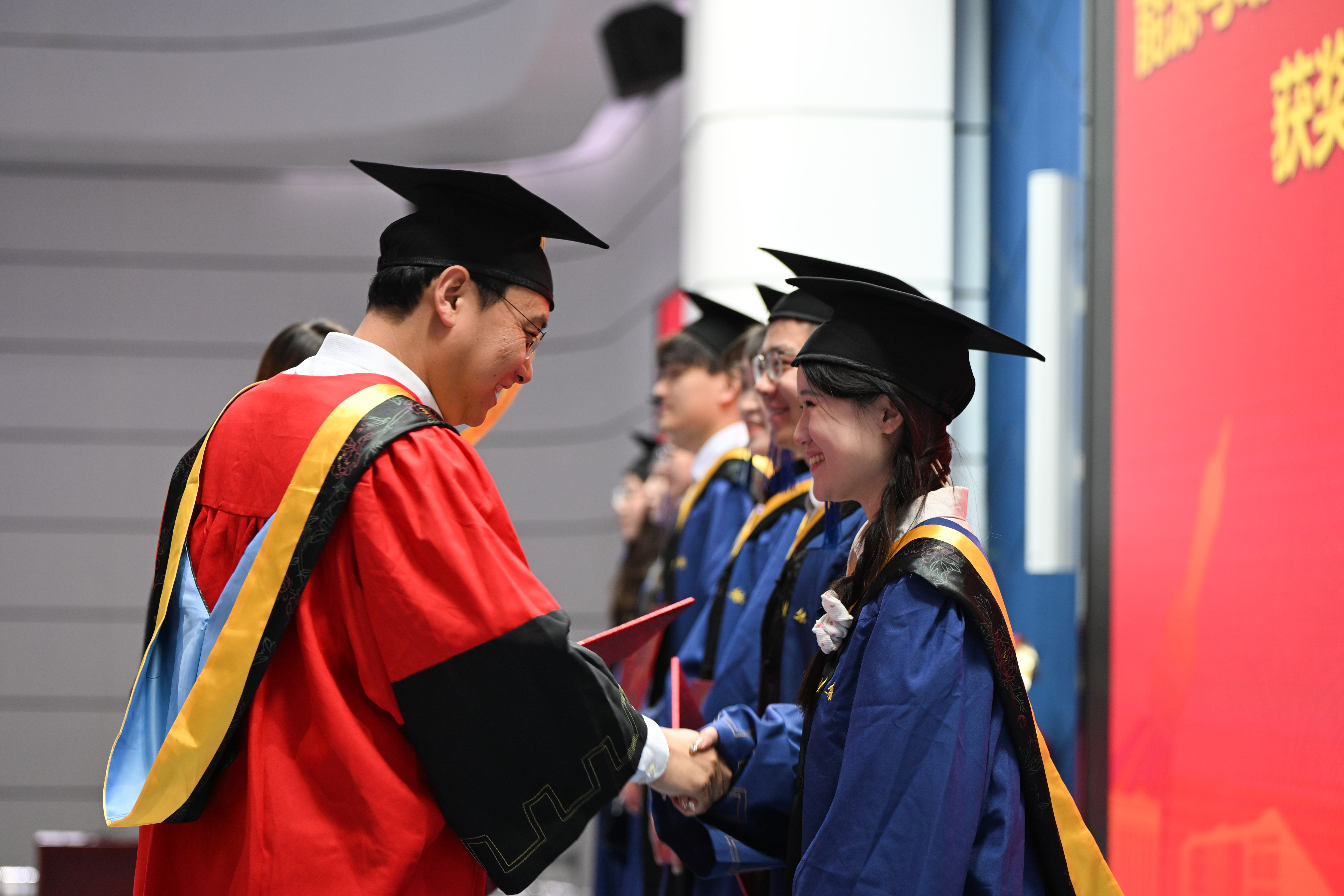 随着庄严的国歌响起,全体师生起立合唱,毕业典礼正式拉开帷幕。