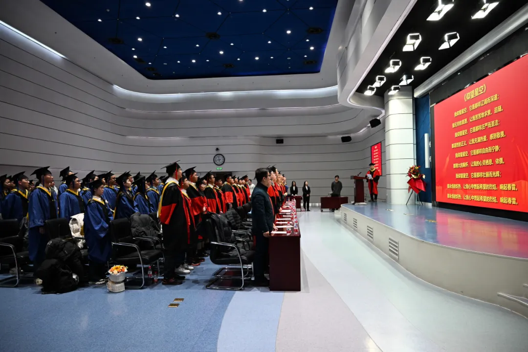 全体师生齐声唱响校歌,《仰望星空》深邃悠远的旋律在报告厅里回荡,将现场气氛推向高潮。歌声中,既包含了毕业生们对母校的依依不舍,也蕴藏着对未来的无限憧憬。