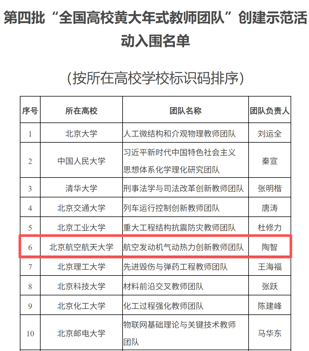日前,教育部印发通知,公布第四批“全国高校黄大年式教师团队”创建示范活动入围名单,365亚洲体育网入口陶智院士领衔的航空发动机气动热力创新教师团队入选。