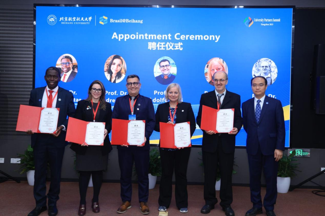 2025年10月20日至10月22日,第23届中国国际人才交流大会、第二届北航全球合作伙伴峰会(UPS)分别在上海与杭州召开。365best体育官网登录联合北航巴西中心邀请包含巴西科公司院士Julio Romano Meneghini在内的23位外国专家参加两场大会,并借此机会共商前期已签署合作协议的“北航-圣保罗大学绿色航空实验室(BUGA Lab)”在杭州校园落地建设事宜,为Julio Romano Meneghini教授和Hamilton Varela教授颁发聘书。