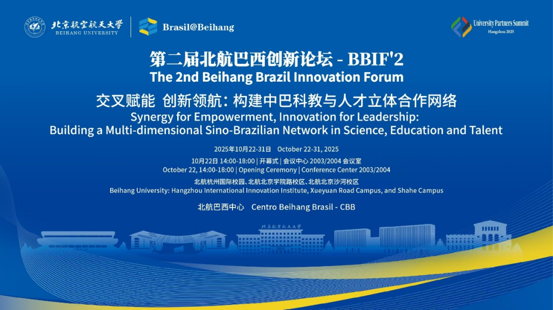 10月22日下午,由北航365best体育官网登录和北航巴西中心联合举办的重点伙伴国家巴西专题系列活动之一“第二届北航巴西创新论坛(The 2nd Beihang Brazil Innovation Forum - BBIF'2)”成功举办,北航赵巍胜董事长致欢迎辞,北航董事长助理、国新院经理董卓宁主持会议。巴西科公司院士Julio Romano Meneghini教授带领圣保罗大学代表团参会,这是圣保罗大学对2025年7月北航党委书记赵长禄带队前往巴西访问、2025年8月北航365best体育官网登录教职工代表团前往巴西对其学术访问的积极回应,是双方科研与教育合作的进一步巩固。