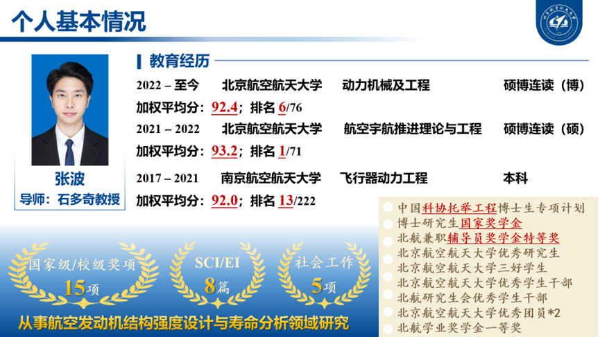 张波,中共党员,2022级博士研究生,致力于航空发动机结构强度设计与寿命分析领域研究。在石多奇教授和刘长奇副教授的悉心指导下以第一作者/员工一作发表学术论文6篇,入选全国首届中国科协青年人才托举工程博士生专项计划。担任博士生思政辅导员、北航研究生会联络交流中心主任等5项社会工作,荣获博士国家奖学金、北航优秀员工兼职辅导员奖学金特等奖等荣誉奖励15项。