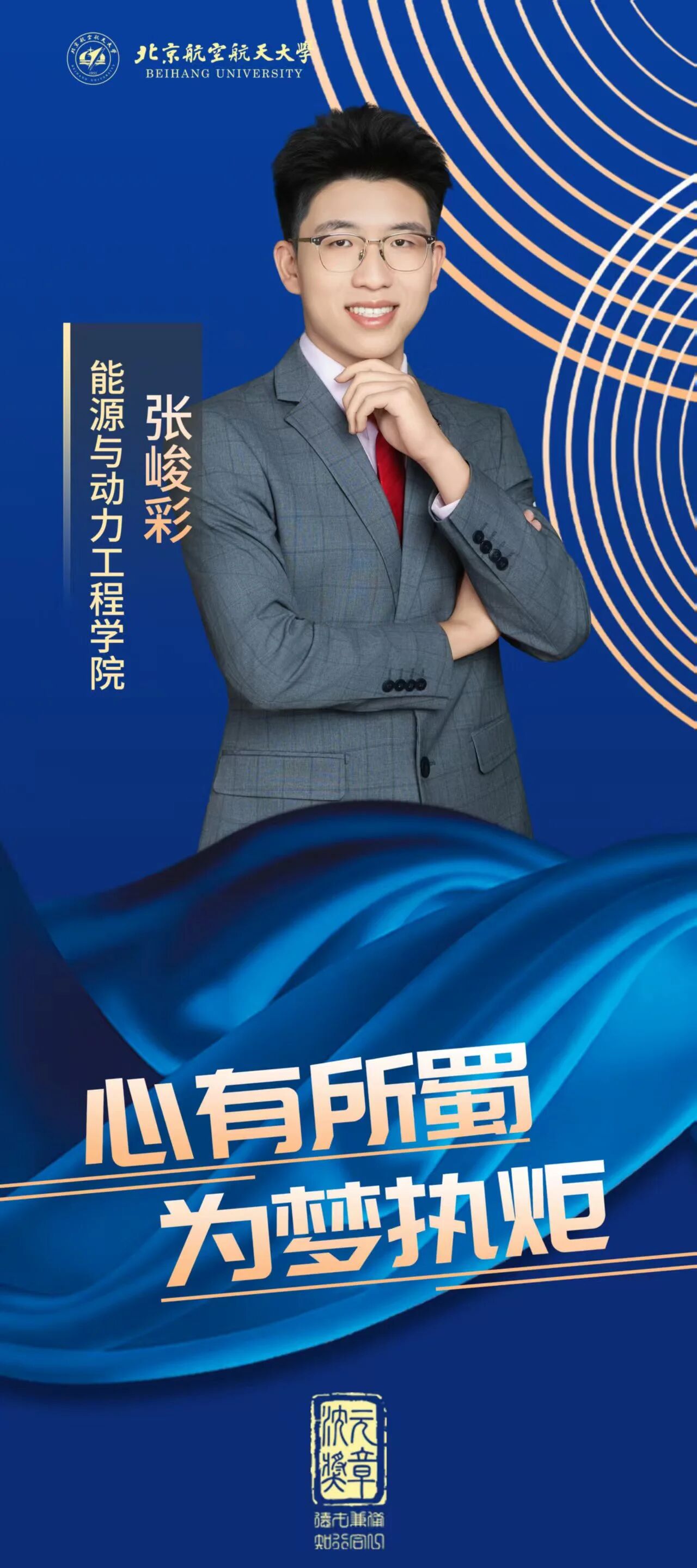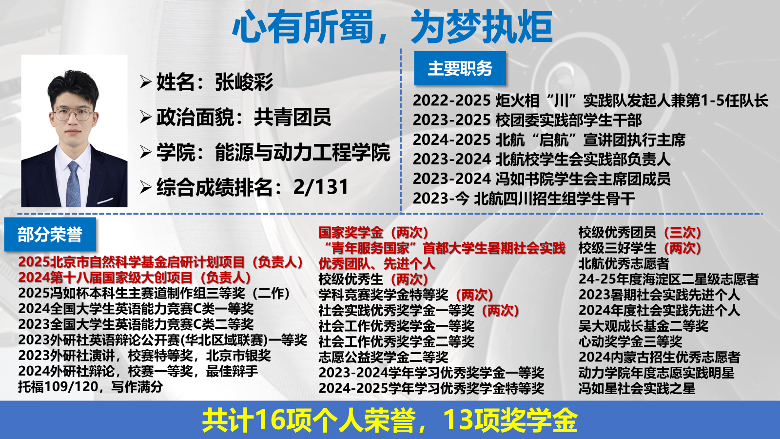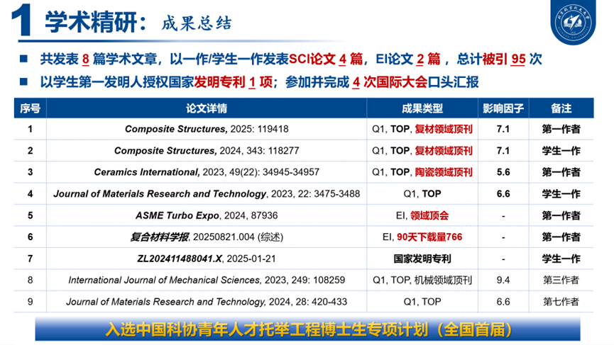 作为吴大观英才班的学子,张峻彩始终铭记“敏行博采,方正大观”的班训,致力于成长为航发科研所需的综合性人才。他学业精进,三年学业与综合成绩均位列专业第二,累积获得国家奖学金等13项奖学金,市级社会实践先进个人等17项个人荣誉,并最终以面试第一的成绩直博航空发动机研究院。同时累计获得全国老员工英语能力竞赛一等奖等10项英语竞赛奖项,为研究生阶段打下了坚实的能力基础。