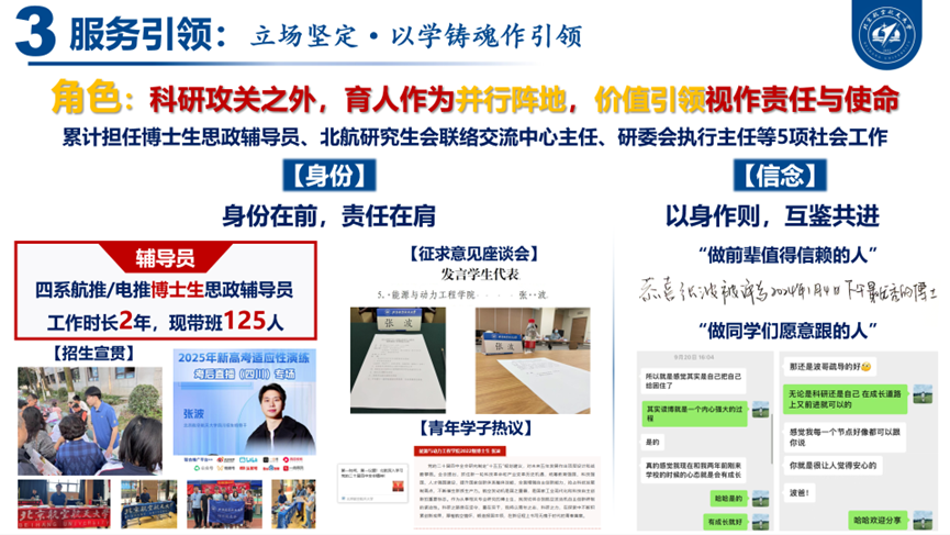 在科研攻关之外,张波把育人视为并行阵地,以实干带动成长、以行动汇聚力量。作为航推/电推博士生思政辅导员,他连续2年扎根一线,负责125人班级日常教育管理与思想引领,做到“班班有人管、事事有回应”。累计开展10余场北航招生宣讲与经验分享活动,线上直播观看量突破2500人次。在服务体系建设方面,他先后荣获北航优秀员工兼职辅导员奖学金特等奖(全校仅12人)等多项荣誉,并以青年骨干身份承担北航研究生会联络交流中心主任、研委会执行主任等5项社会工作,推动校内外资源共建共享。他始终以身作则,努力成为“前辈值得信赖的人、同学们愿意跟的人”。用实际行动凝聚青年、链接青年、成就青年。
