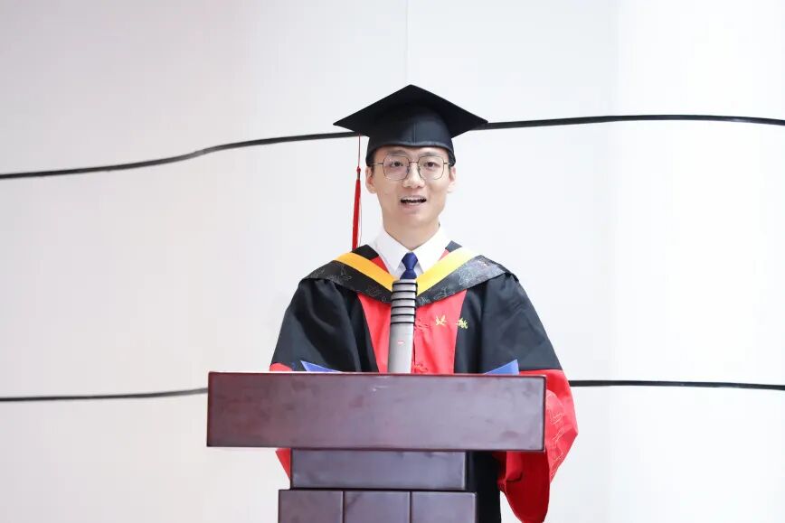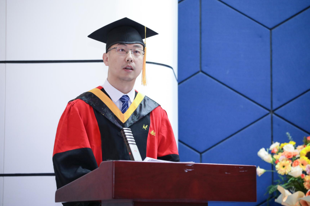 教师代表邱璐向全体毕业生致以最热烈的祝贺。在送别之际,他以“三颗心”勉励全体毕业生:一是坚守报国之心,将个人梦想融入祖国发展敢于创新、勇闯前沿;二是永葆赤子之心,保持对世界的好奇、对理想的纯粹、对生命的热爱,不失真诚与热忱;三是常怀感恩之心,将父母、师长所赋予的恩情化为前行的力量,以行动回馈家国。