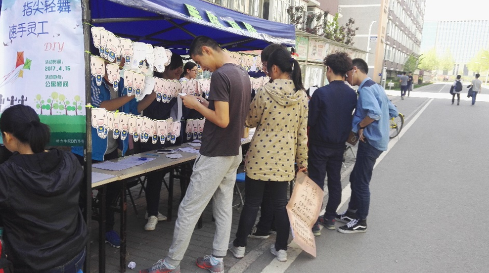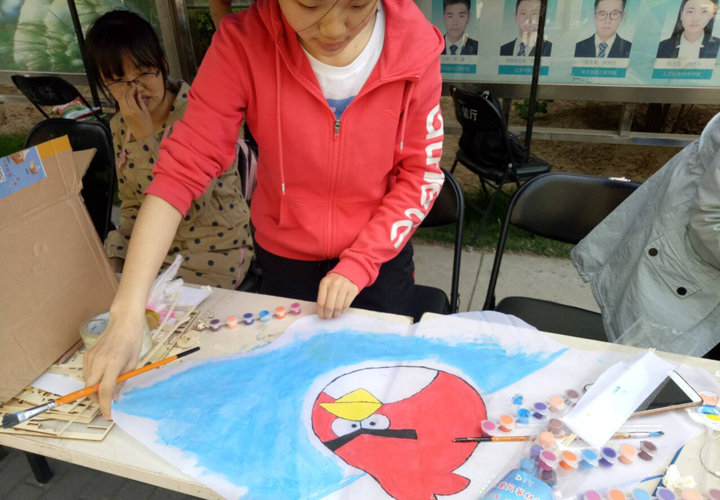 本次的外场活动在公寓楼间的十字路口处举行。共由五个部分组成,分别为“制作风筝”、“手绘个性风筝”、“模型拼插”、“智力答题”、“抽积木”。此次活动旨在通过手工制作的活动与小游戏让同学们走出寝室,体验春天、亲近自然。活动的规则为来参加外场的同学们选择自己感兴趣的活动,每完成一个小活动都会获得相应的积分,凭借积分可以兑换礼品。