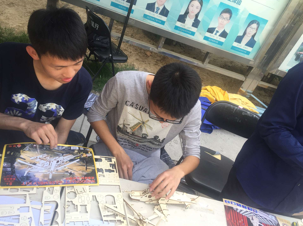 在拼插木模型的环节中,同学们将零散的木片拼插出立体模型。尽管颇有难度,但是这项活动依然获得了很高的参与度。不少同学都成功拼插出立体模型,获得积分。