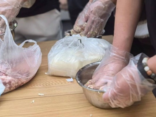 同学们各自组队,每组由技术娴熟的同学为新手同学讲解演示包饺子的方法,大家分工明确,现场其乐融融,好不热闹。
