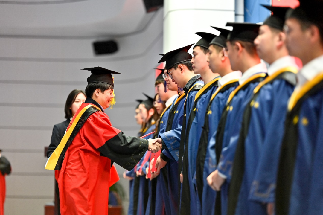 典礼最后,举行了2024届研究生毕业生学位授予仪式,院领导及导师代表为在场的毕业生——拨苏正冠,送上美好祝愿。
