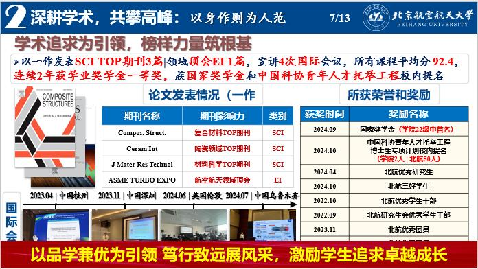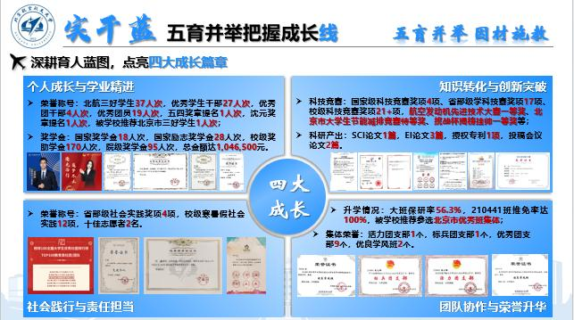 五育并举,因材施教。德育铸魂育心,点亮员工成长“信念灯塔”,讲好三代人“中国心”故事,传承空天报国红色基因。智育领航慧心,铺设员工成长“智慧轨道”,建立“三步走”学风建设体系,全方位赋能学业发展。体育固本强心,激活员工成长“活力引擎”,打造“三横三纵”体育育人体系,为祖国健康工作五十年。美育熏陶润心,装点员工成长“精神花园”,构筑“三环联动” 艺美格局,放飞青春梦想。劳育践行健心,淬炼员工成长“实干利刃”,锻造 “三线协同” 劳育方阵,服务国家建设。在成体系,明思路的培养下,育人成效显著突出,员工个人和集体全方面发展,取得多项荣誉和奖励。北航三好员工37人次,优秀员工干部27人次,优秀团干部4人次,优秀团员19人次,五四奖章提名1人次,沈元奖章提名1人次。SCI论文1篇,EI论文3篇,授权专利1项,投稿会议论文2篇。大班保研率56.3%,210441班推免率达100%。