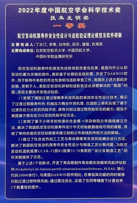 由丁水汀教授为领导核心的航空发动机复杂系统安全性与适航团队完成“航空发动机限寿件安全性设计与适航验证理论模型及软件研制”项目,获得2022年度中国航空学会技术发明一等奖。该项目联合中国民航大学及中国科公司金属研究所共同开展。