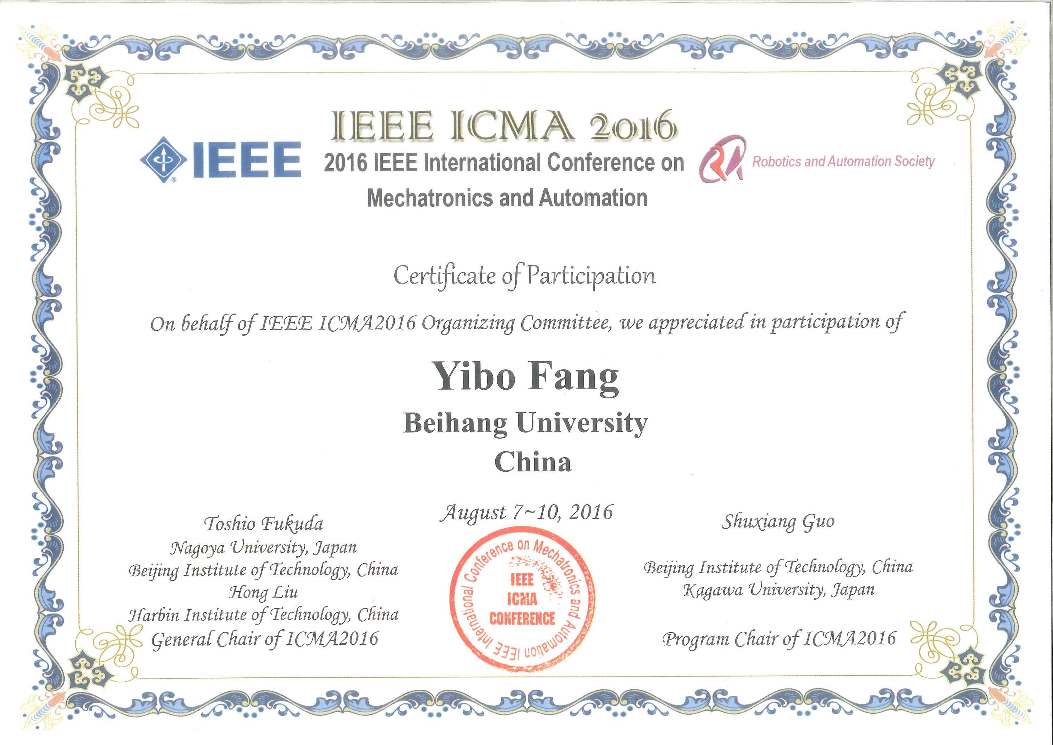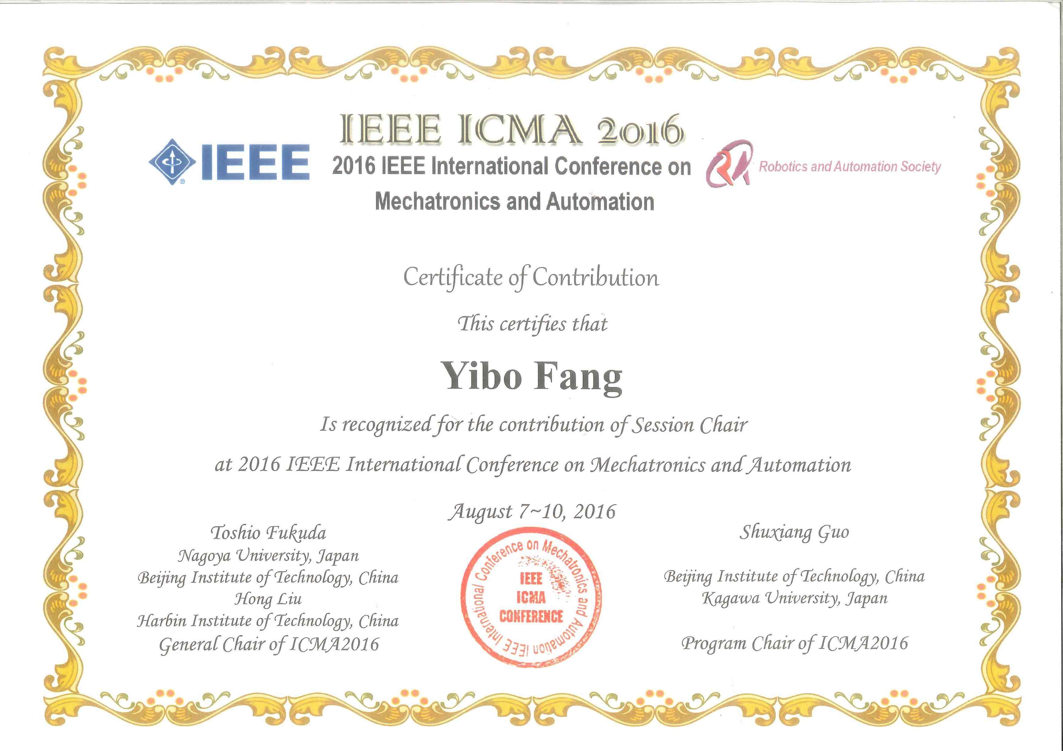 2016年8月7日至10日,由美国电气电子工程师学会、国家自然科学基金委员会等资助的IEEE ICMA 2016机电一体化与自动化国际会议(2016 IEEE International Conference on Mechatronics and Automation)在哈尔滨召开。来自中国、美国、加拿大、澳大利亚等约31个国家和地区的500余名专家、学者参加了此次会议。